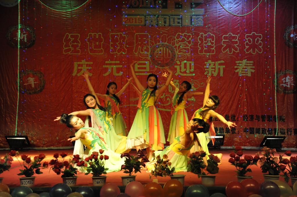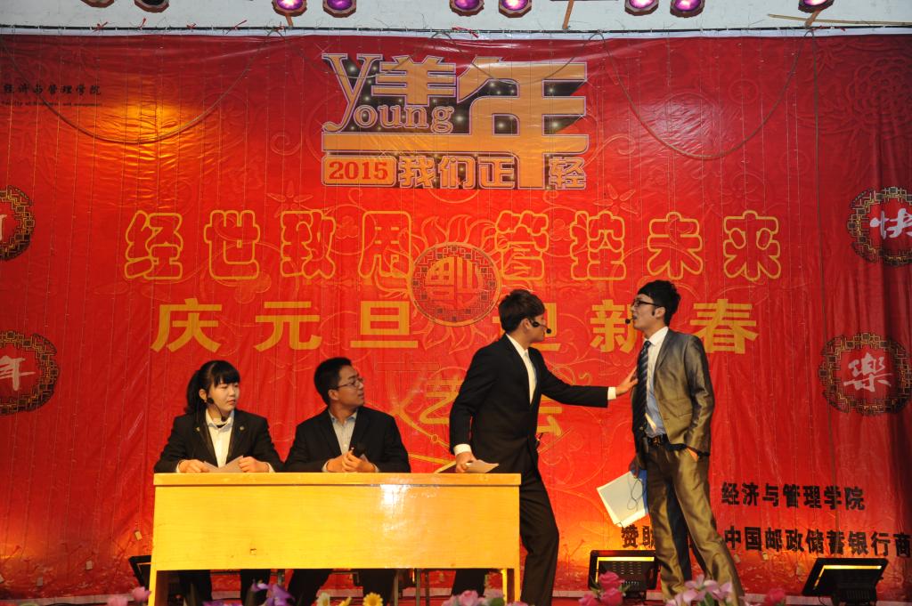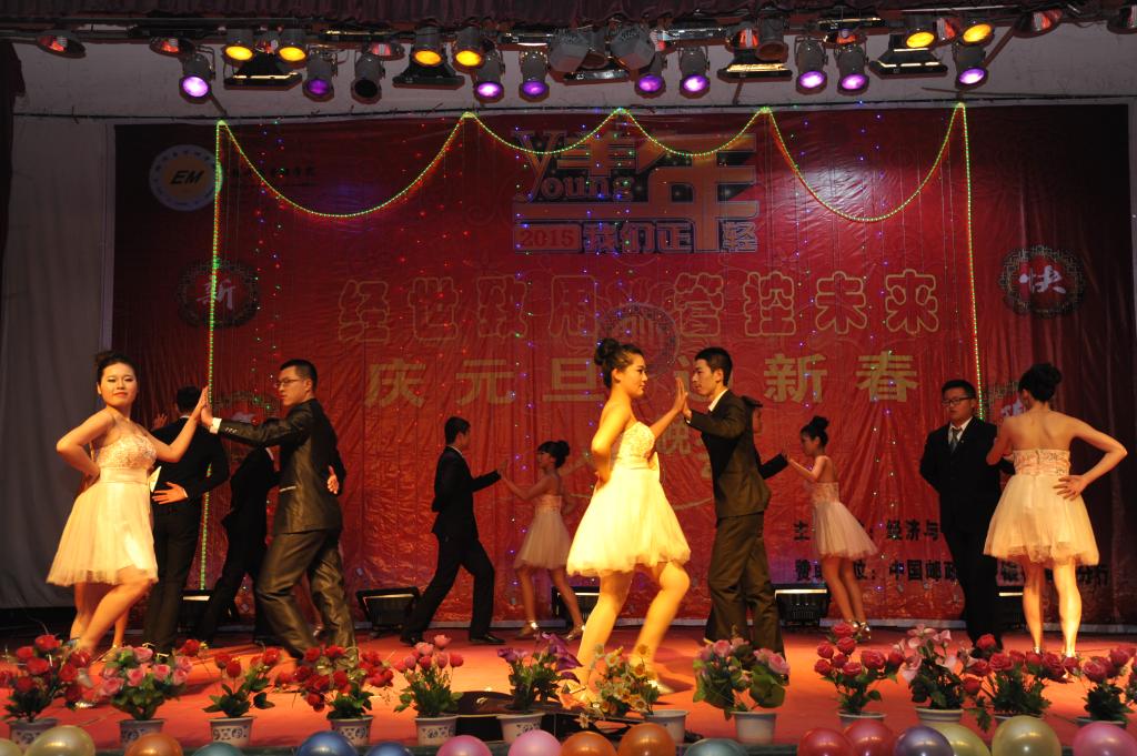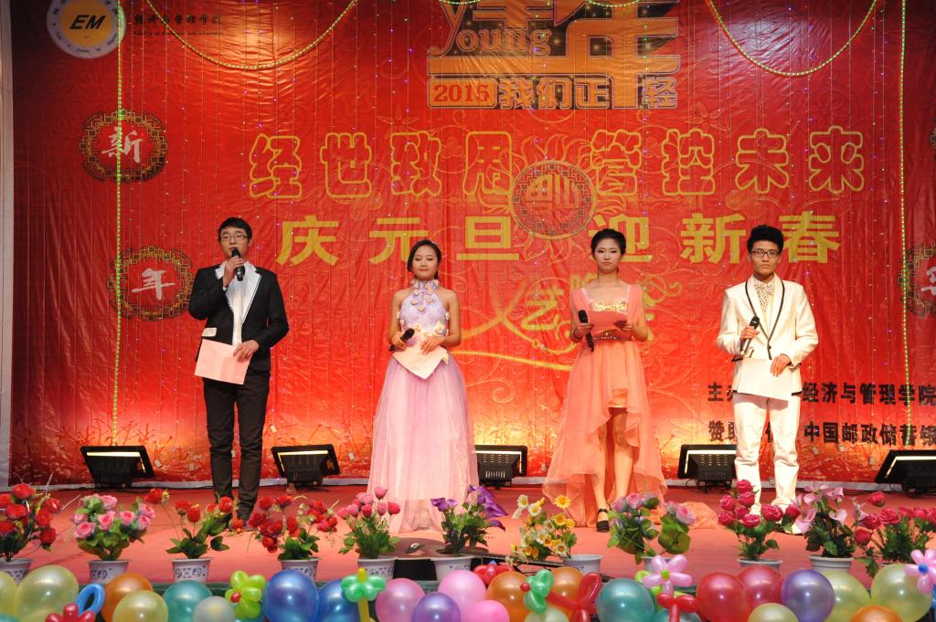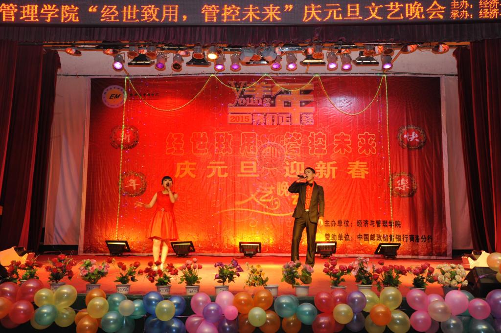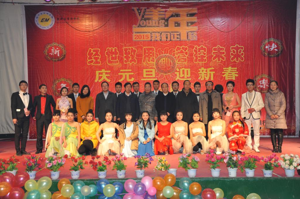 为庆祝元旦佳节,也为进一步推进公司文艺活动的蓬勃发展,丰富校园文化生活,活跃学习氛围,给同学们一个真正展示自我风采和勇气的舞台。经济与管理公司于2014年12月17日19:30在老员工活动中心举办以“经世致用,管控未来”为主题的元旦晚会。莅临本次晚会并在前排就座的领导和嘉宾有:教务处处长李超、员工处处长石启英、校工会副主席丁争尚、财务处处长郭瑾、财务处副处长周小婷、语言文化传播公司党总支书记王正良、城乡规划与建筑工程公司党总支副书记任康民、经济与管理公司经理樊景博、经济与管理公司副经理王怡、经济与管理公司团总支书记于晓明及经济与管理公司全体老师和辅导员。