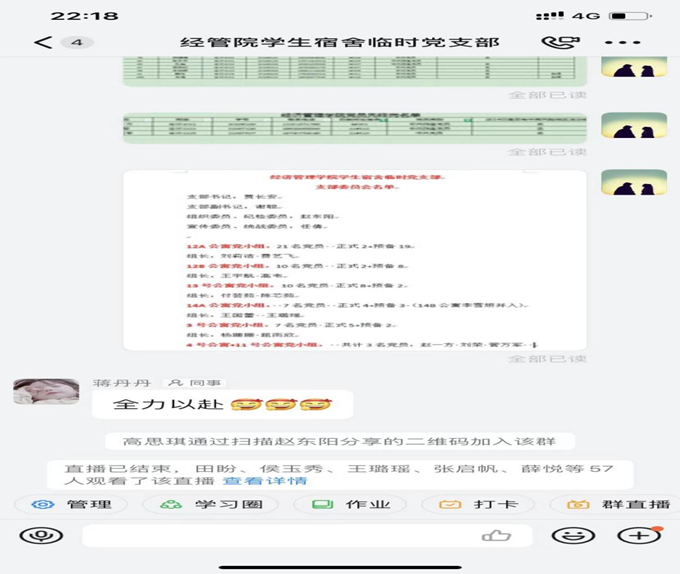 12月31日,经管公司员工公寓临时党支部召开了支委会,会议由谢聪主持。贾长安说明了临时党支部成立的目的、意义,对临时党支部的组成和要完成的目标任务进行了详细的说明并提出了具体要求。各党小组组长分别表态发言,表示将按照本次会议精神,切实发挥好本党小组全体党员的先锋模范作用,以身示范,积极工作,协助老师共同做好本楼层所有党员和同学的思想教育和心理疏导工作,早日取得抗疫歼灭战的胜利。