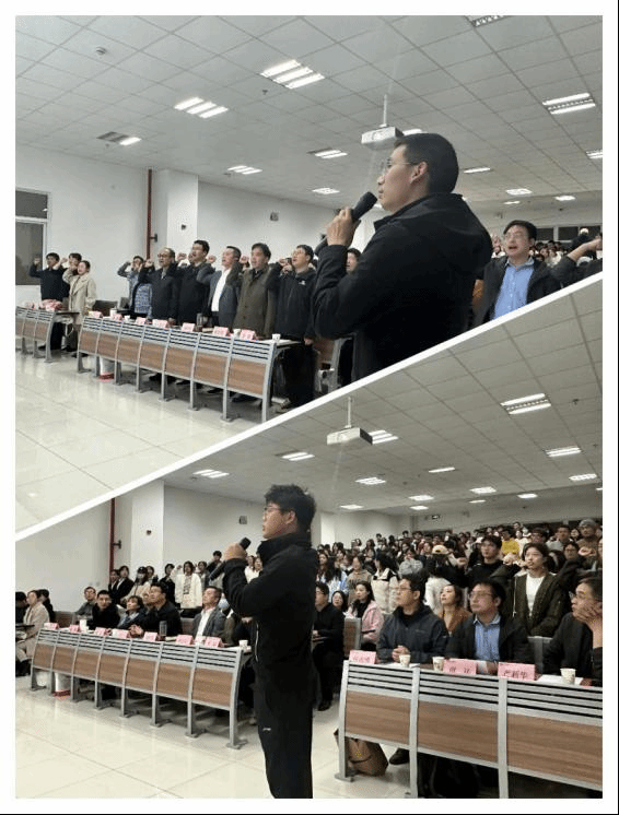 田祎老师通过对音乐《理想》的分享为全体师生诵读与分享了一段经典,引导全体师生心怀理想、不懈奋斗。全体师生也都备受鼓舞,与会教师在王程老师带领下进行了庄严的宣誓,与会员工在刘奕喆同学的带领下进行了郑重承诺。