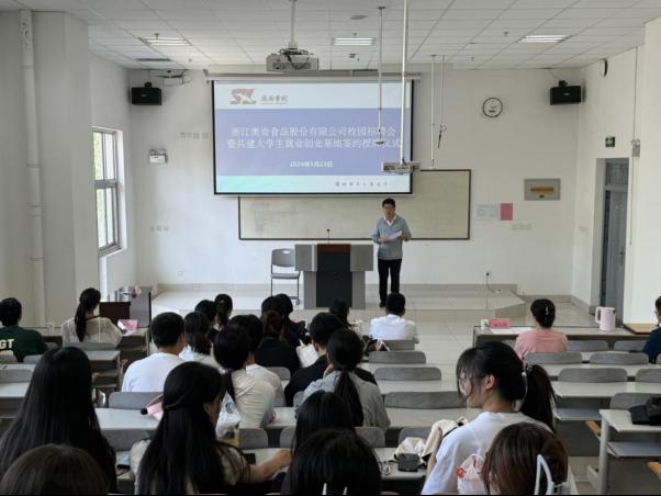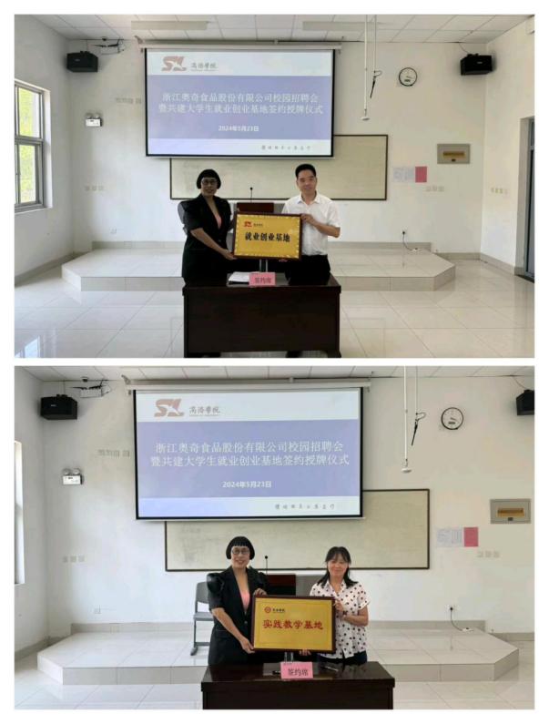 5月23日,bevictor伟德与浙江奥奇食品股份有限公司在8号多媒体30开展专场校园招聘会暨共建老员工就业创业基地签约授牌仪式,浙江奥奇食品股份有限公司董事长陈晓静、营运总监过承姬、办公室主任费三妹,公司党委副书记副经理贾长安、副经理雷清、毕业班辅导员和2024届部分毕业生代表、2021级在校员工代表出席会议。会议由学工办主任赵东阳主持。
