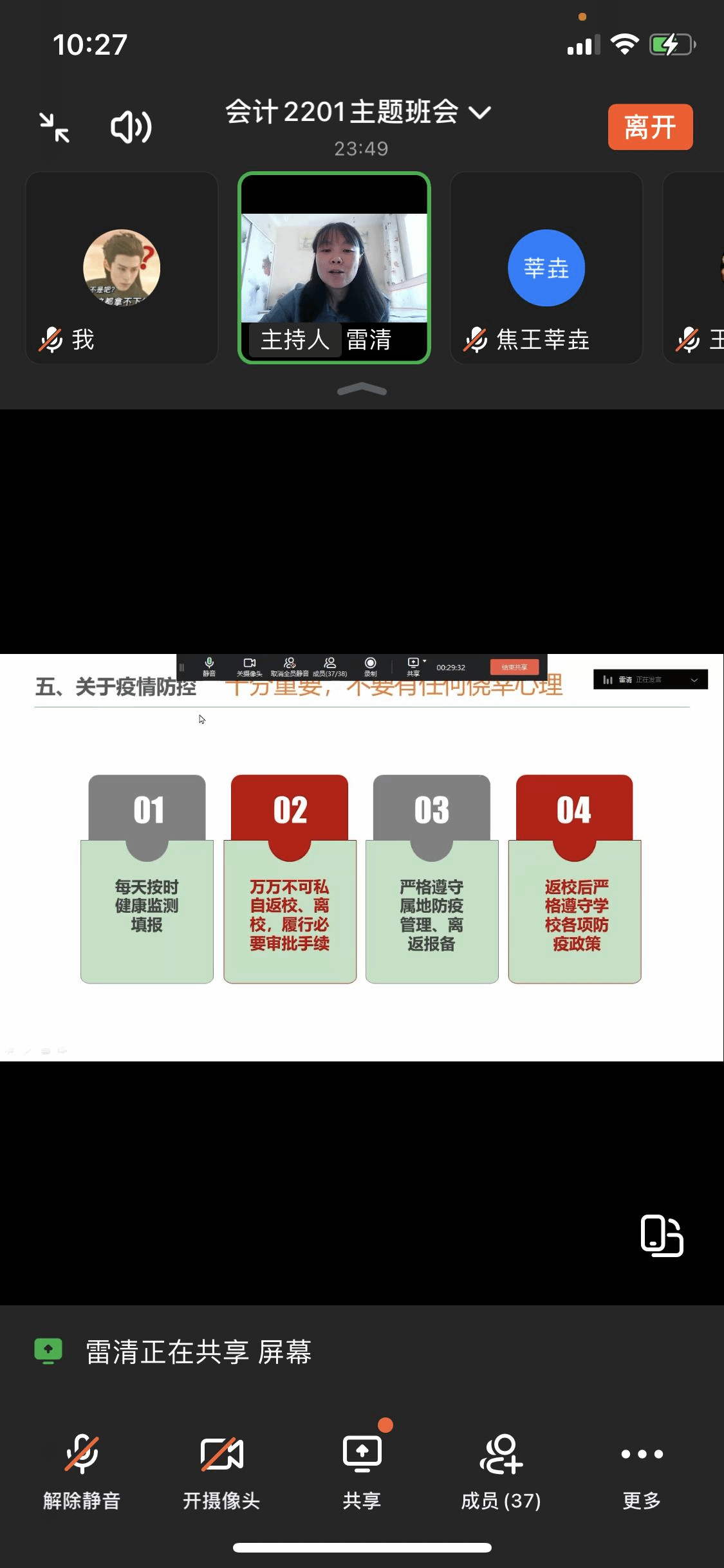 首先,班主任带领同学们详细学习、解读《高等公司新冠肺炎疫情防控技术方案(第六版)》内容,提高员工疫情防控意识,进一步增强“健康第一责任人”理念;希望同学们严格遵守公司的各项规章制度,配合疫情防控相关政策和要求,注重自己人身、财产安全,增强自身的防火、防盗意识,主动配合公司和公司各项工作安排,为圆满完成学业创造安全和谐的外部条件。