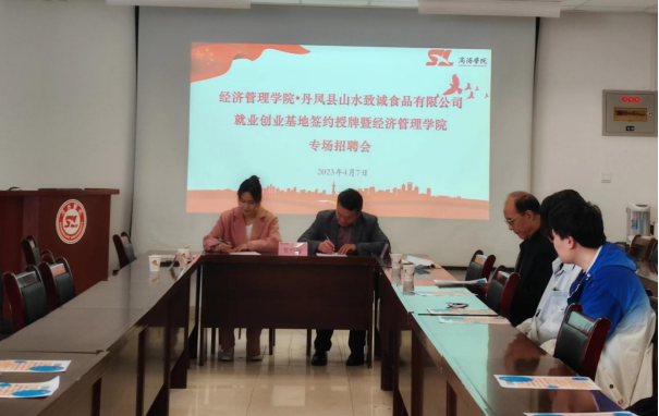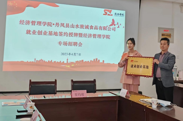 高扩昌与丹凤县山水致诚食品有限公司人事主管史娇签订共建老员工就业创业基地协议并授牌。双方表示将在人才培养、人才输送、毕业生实习、就业创业工作等方面进行深度合作与交流,实现人才培养与企业用人共赢的校企合作格局。