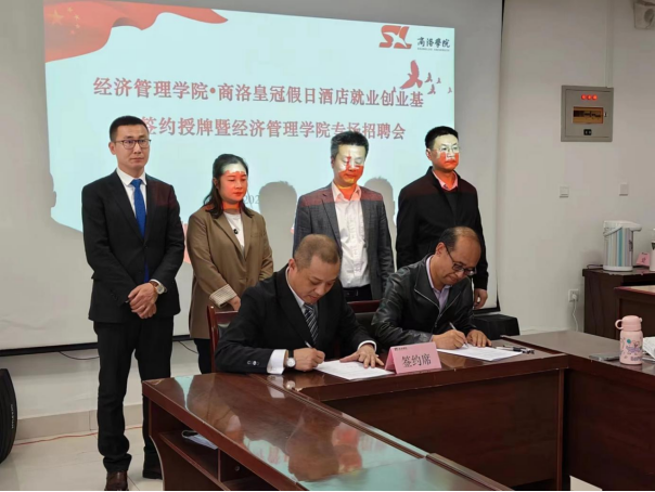 张林代表公司与商洛皇冠假日酒店总经理金宗亮签订共建老员工就业创业基地协议,高扩昌代表公司对商洛皇冠假日酒店进行授牌。双方表示将在人才培养、人才输送、毕业生实习、就业创业工作等方面进行深度合作与交流,实现人才培养与企业用人共赢的校企合作格局。