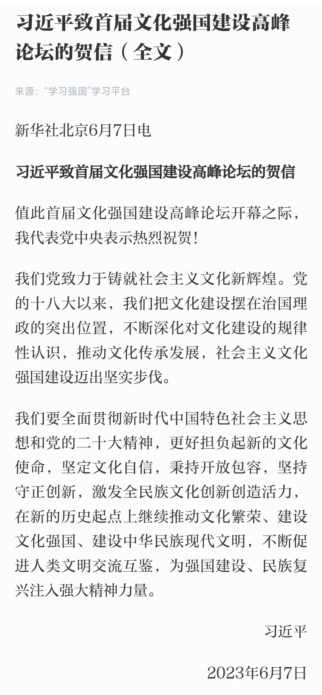 【學習卡片】习近平致首届文化强国建设高峰论坛的贺信(全文)