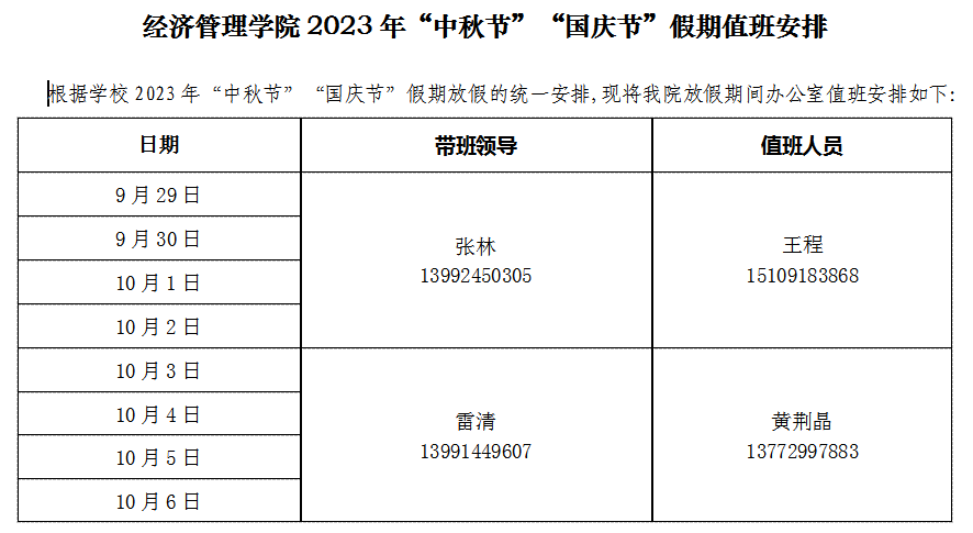 【值班安排】2023年“中秋节”“国庆节”假期值班安排