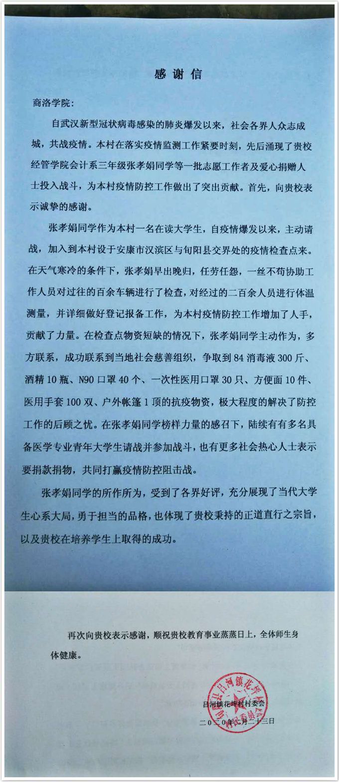 张孝娟同学的事迹受到乡镇领导、公安民警、村委会书记等人的一致好评,为对张孝娟同学本人以及伟德官网bv致谢,吕河镇花坪村村委会专门向公司发来了感谢信。