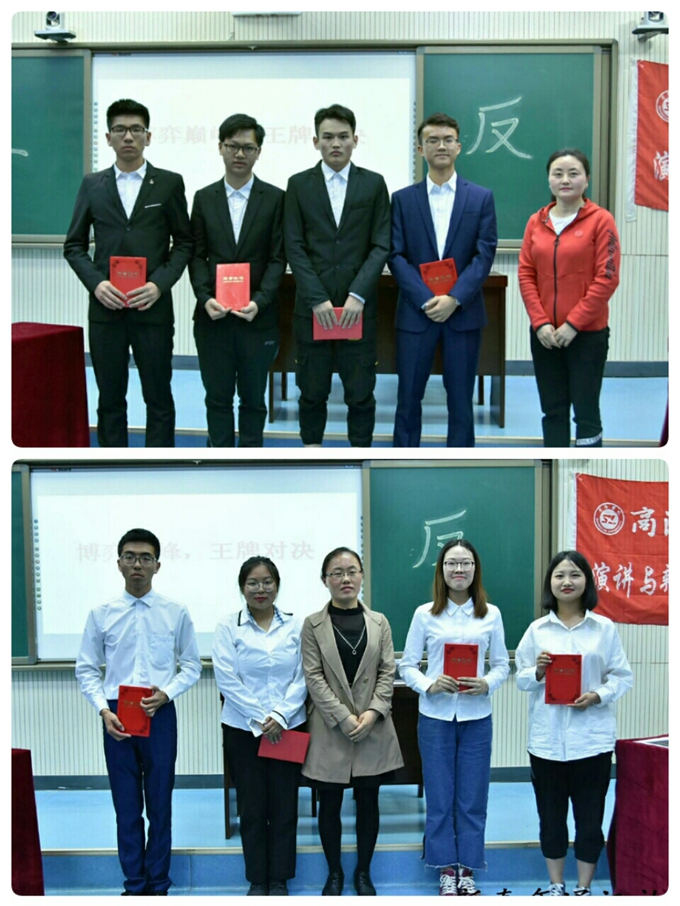 双方辩手激昂慷慨,抑扬顿挫,妙语连珠,气氛十分活跃,赢得了现场观众阵阵掌声。经过激烈角逐,来自电子信息工程1802班的陈杰夺得最佳辩手,由电子商务1801班的王明强、电子商务1802班的王荣荣和祝婉莹、财务管理1701班的郭从容所组成的正方队伍获得最佳团队奖,由电子信息工程1802班的付少帅、陈杰、杨帆、常荣耀组成的反方队伍获得优秀团队奖。
