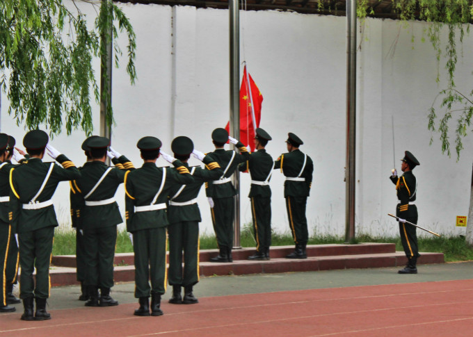 晨曦徐徐拉开了帷幕,一切都纯净的让人心旷神怡。伴随着神圣的国歌声,国旗护卫队迈着整齐的步伐,升起了光芒万丈的五星红旗。全体师生庄严肃立,国旗点燃了革命的火种,震撼着民族的灵魂。