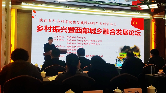 本次论坛由陕西省社会科公司主办,陕西省社会科公司农村发展研究所和社会学研究所承办,陕西省社会学会、陕西省经济学会、当代陕西研究会、《人文杂志》社/《新西部》杂志社协办。来自省内外的100余名专家学者齐聚一堂,就乡村振兴与城乡融合进行了交流研讨。论坛分为主旨演讲和专题研讨两个环节,有5位专家作了主旨演讲,10位专家在专题研讨环节交流发言。农业农村部党校副董事长朱守银作了《乡村多样性差异性价值与城乡融合发展》主旨演讲,中共陕西省委农村工作办公室秘书处处长王军作了《陕西实施乡村振兴的进展、重点与展望》主旨演讲,重庆市社会科公司农村发展研究所所长许玉明作了《“互联网+现代农业”:城乡融合的一个案例》主旨演讲,西安交通大学博士生导师李聪作了《和谐人与自然:从易地扶贫搬迁到乡村振兴》主旨演讲,陕西省社会科公司农村发展研究所副所长罗丞作了《决战决胜脱贫攻坚:态势与思考》主旨演讲。