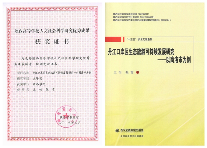 公司一项成果荣获2019年度陕西高校人文社科研究优秀成果奖 发布时间:2019-05-24 点击: 根据陕西省教育厅发布的《陕西省教育厅关于公布2019年度陕西高等公司人文社会科学研究优秀成果奖励结果的通知》(陕教[2019]81号),公司王怡教授和张雪老师合作完成的科技成果《丹江口库区生态旅游可持续发展研究——以商洛市为例》获得2019年度陕西高等公司人文社会科学研究优秀成果奖三等奖。 (图/文 郭萌 编辑/郭萌 审核/王怡)