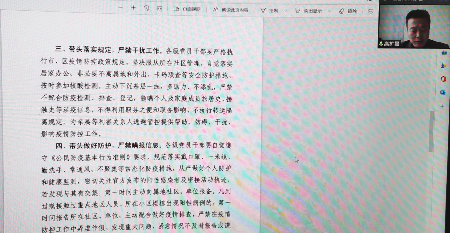 雷娜同志领学了党的二十大报告中第二部分即开辟马克思主义中国化时代化新境界,高扩昌同志领学了《中共商洛市委组织部关于在疫情防控中进一步从严加强党员干部管理的通知》。杨鹏飞和薛羽蒙结合自己的工作实际和防疫抗疫情况就参加员工返校静态管理工作做了交流发言。教工第一党支部书记张红霞为全体党员讲了题为《学习贯彻党的二十大精神五个牢牢把握》的党课。