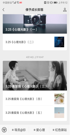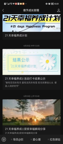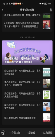 ——建设幸福训练+“爱心理幸福空间站”。经管公司依托公司官方网站、微信公众号,以及“倩予成长部落”心育导师个人微信公众号,特设“爱心理”板块积极创新网络育人栏目,运用网络媒体做好老员工思想和心理引导。往期专题推文“我的大学时光是你正在经历的青春”“3.25心理光影”“老员工幸福训练营”等,以乐观、赞美和成就为主题采用网文+老员工幸福训练营线下团辅的形式,深入开展心理健康教育实践,积极寻找老员工思想政治工作与心理健康教育的契合点,更深更有力地育心赋能,收到广老员工欢迎和转发,阅读点击量达屡创新高。